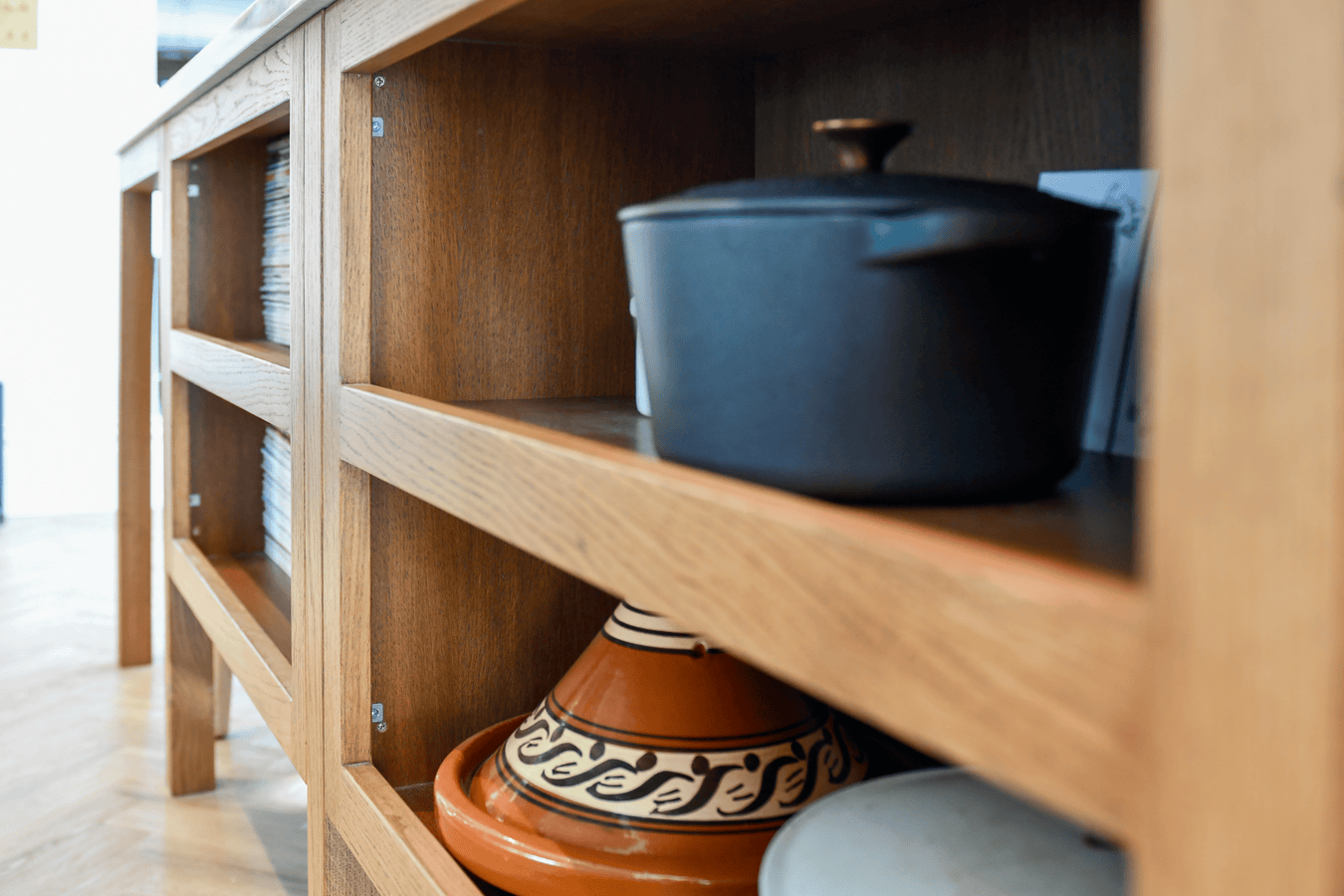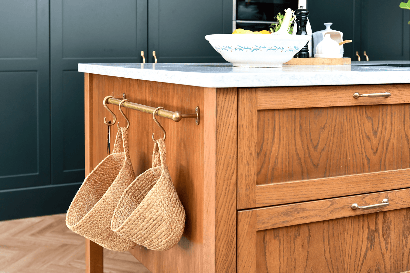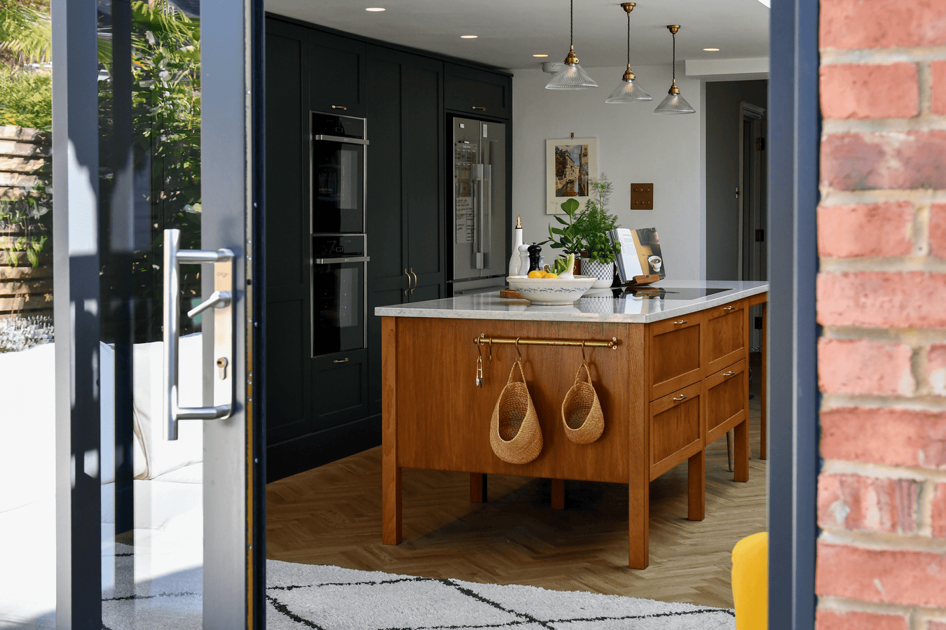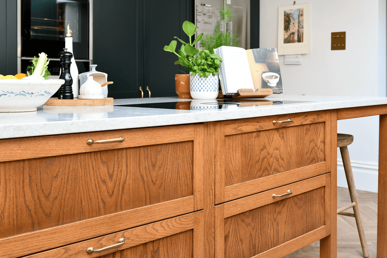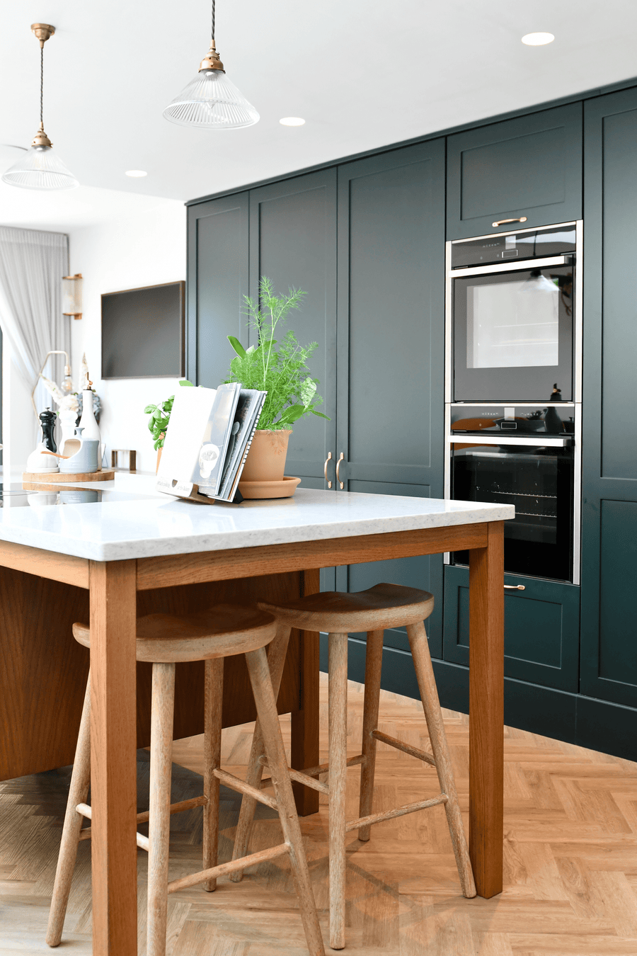 At the heart of the kitchen stands a stained oak shaker-style island This statement unit features bespoke pilasters, integrated shelving, and practical drawers, blending elegance with function. Its stained oak finish introduces natural warmth that complements the darker studio green cabinetry.