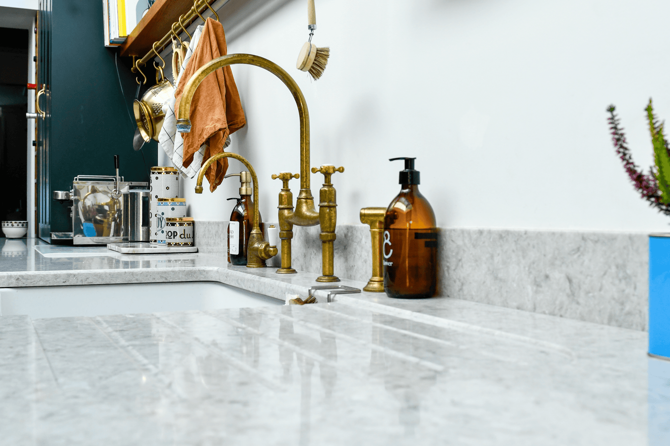 The design centres on a rich palette of materials and textures. Farrow & Ball Studio Green cabinetry sets the foundation, creating depth and sophistication, while brushed bronze taps and handles add warmth and a subtle metallic contrast. These finishes were chosen to elevate the shaker framework and highlight the bespoke craftsmanship.